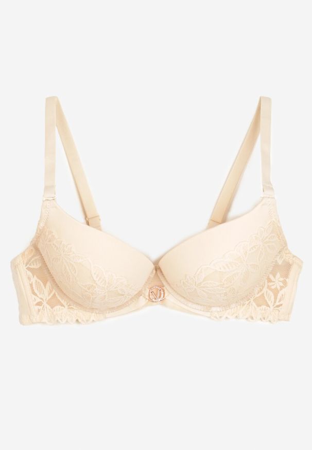 Born2be - Jasnobeżowy Biustonosz Push-Up z Koronkowym Paskiem Sarolin. Kolor: beżowy. Materiał: koronka. Rodzaj stanika: push-up
