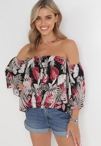 Lou-Lou - Bluzka z Dekoltem Carmen w Jasne Kwiaty. Typ kołnierza: typu carmen. Materiał: poliester, elastan. Wzór: kwiaty