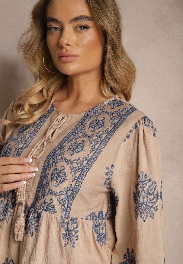 Renee - Beżowa Bawełniana Bluzka Ozdobiona Falbankami i Ażurowym Wzorem Grelzeki. Okazja: na co dzień. Typ kołnierza: kołnierz z falbankami. Kolor: beżowy. Materiał: bawełna. Długość rękawa: krótki rękaw. Długość: krótkie. Wzór: aplikacja, ażurowy. Styl: casual, elegancki