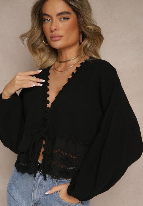 Renee - Czarna Bluzka z Elastycznej Bawełny Ozdobiona Guzikami i Koronką Senura. Okazja: na co dzień, do pracy, na spotkanie biznesowe. Typ kołnierza: dekolt w kształcie V. Kolor: czarny. Materiał: koronka, bawełna. Wzór: koronka, aplikacja. Sezon: jesień, wiosna. Styl: biznesowy, klasyczny, casual, elegancki