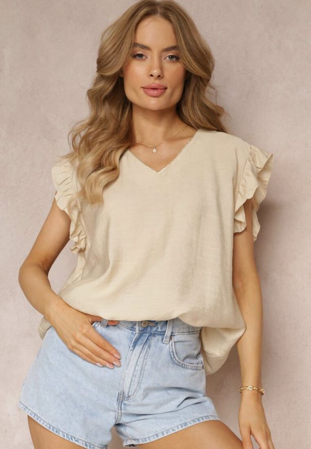 Renee - Niebiesko-Beżowa Wiskozowa Bluzka z Lnem Zdobiona Falbankami Zirenda. Okazja: na co dzień, na spotkanie biznesowe. Typ kołnierza: kołnierz z falbankami. Kolor: niebieski. Materiał: len, wiskoza. Długość rękawa: krótki rękaw. Długość: krótkie. Wzór: aplikacja. Styl: biznesowy, klasyczny, casual