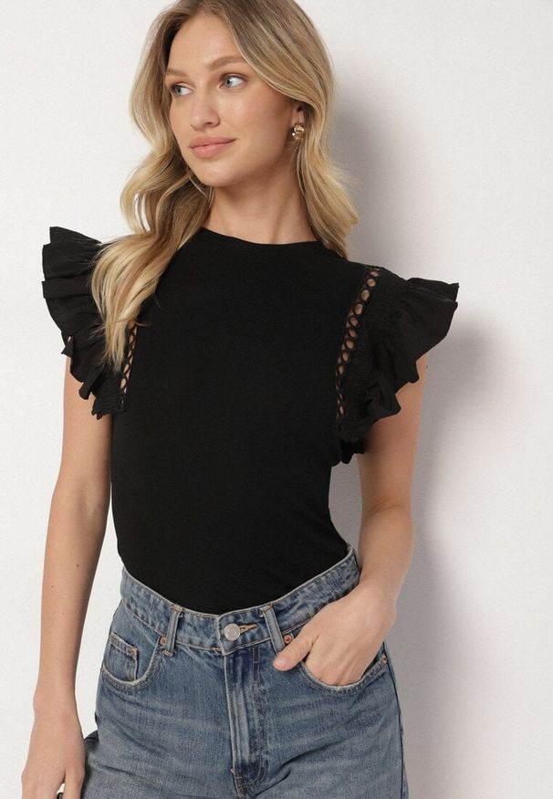 Born2be - Czarna Bawełniana Bluzka Ozdobiona Ażurowym Wzorem i Falbankami Ridiruna. Okazja: na co dzień. Typ kołnierza: kołnierz z falbankami. Kolor: czarny. Materiał: bawełna. Wzór: aplikacja, ażurowy. Styl: casual