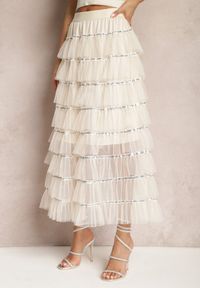 Renee - Jasnobeżowa Spódnica Maxi z Rozkloszowanym Dołem Zdobiona Tiulowymi Falbankami Hadlie. Kolor: beżowy. Materiał: tiul. Wzór: aplikacja
