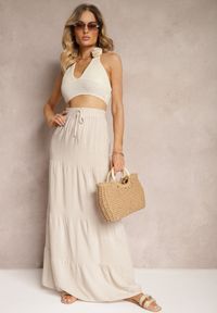 Renee - Beżowa Wiskozowa Spódnica Maxi z Gumką w Talii i Falbankami na Dole Maisina. Kolor: beżowy. Materiał: wiskoza. Sezon: wiosna, lato