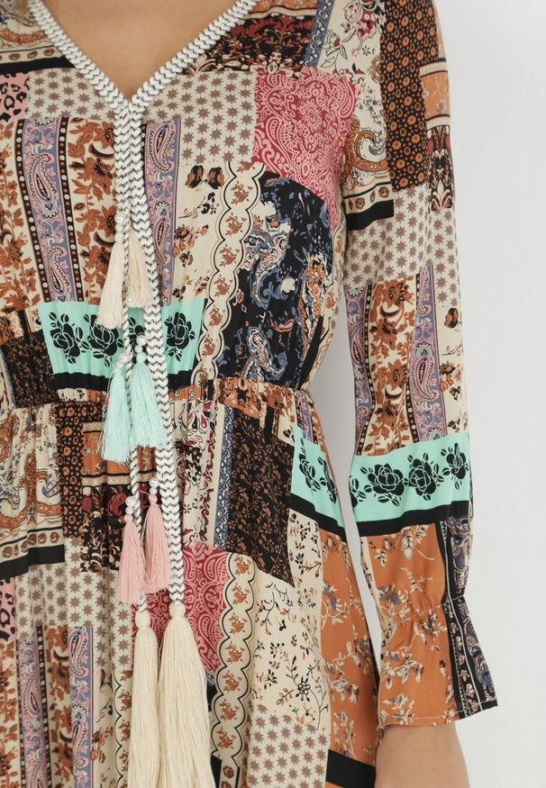 Renee - Zielono-Beżowa Sukienka Fionowen. Okazja: na spacer. Typ kołnierza: dekolt w kształcie V. Kolor: zielony. Materiał: len