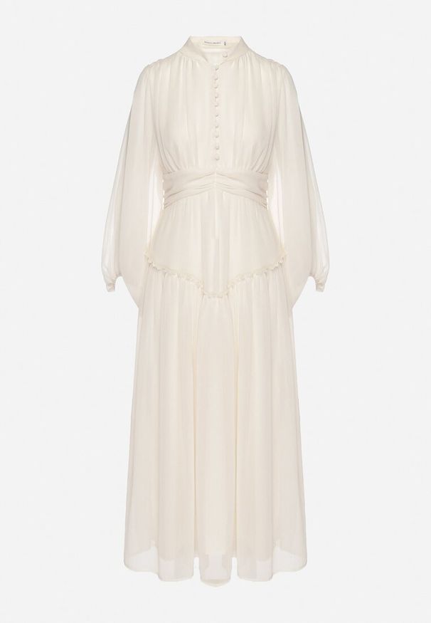 Renee - Jasnobeżowa Elegancka Sukienka w Stylu Vintage z Powlekanymi Guzikami i Marszczeniami Lefandia. Typ kołnierza: kołnierzyk stójkowy. Kolor: beżowy. Styl: vintage, elegancki
