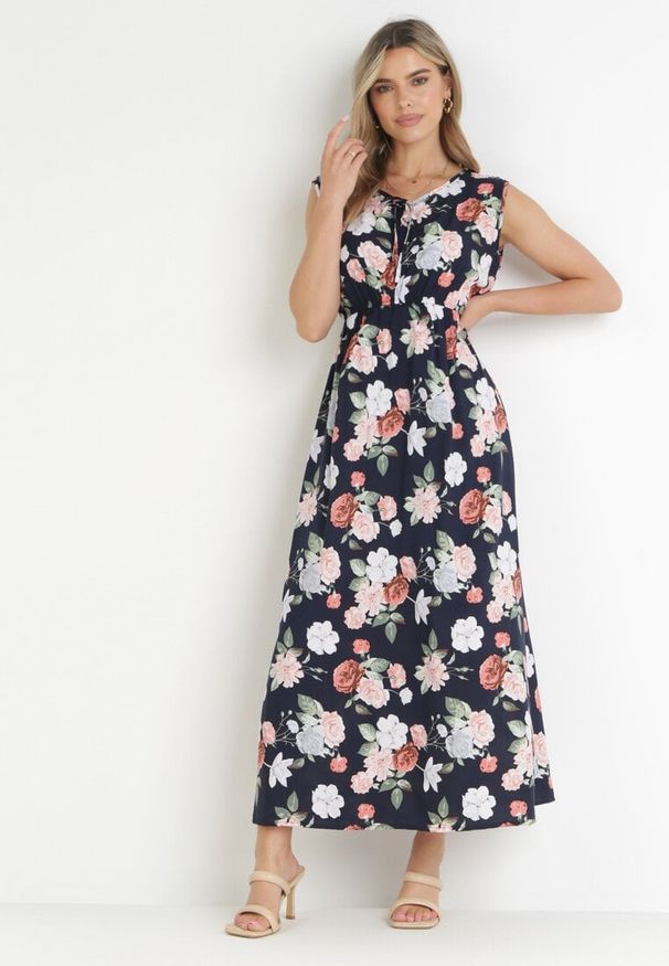 Born2be - Niebieska Rozkloszowana Sukienka Maxi z Ozdobnym Dekoltem i Gumką w Talii z Wiskozy Adyni. Typ kołnierza: kołnierz z falbankami. Kolor: niebieski. Materiał: wiskoza. Długość rękawa: bez rękawów. Długość: maxi