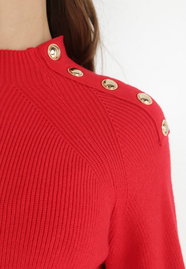 Born2be - Czerwony Wiskozowy Sweter z Ozdobnymi Guzikami Cyrkoniami i Metalicznymi Koralikami Leopoldi. Kolor: czerwony. Materiał: wiskoza. Długość rękawa: długi rękaw. Długość: długie