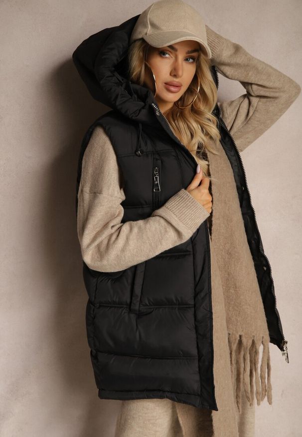 Renee - Czarna Kamizelka Pikowana o Długim Kroju z Kapturem Zapinana na Suwak Terilenes. Okazja: na co dzień, na spacer. Typ kołnierza: kaptur. Kolor: czarny. Materiał: jeans. Długość: długie. Styl: casual, elegancki