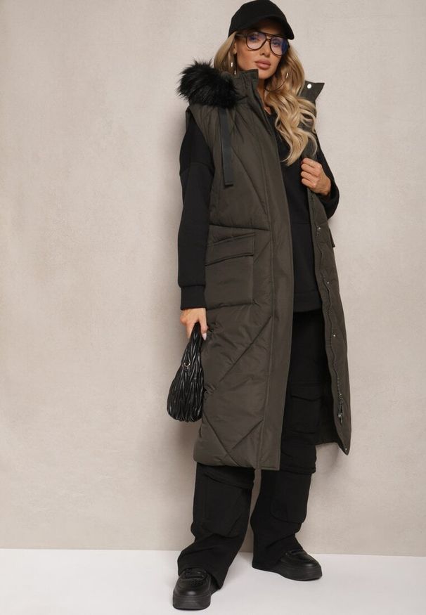 Renee - Ciemnozielona Kamizelka o Długim Kroju z Pikowaniem i Kapturem Ozdobiona Futerkiem Avarilla. Okazja: na co dzień. Typ kołnierza: kaptur. Kolor: zielony. Materiał: futro. Długość: długie. Wzór: aplikacja. Styl: wizytowy, casual, elegancki