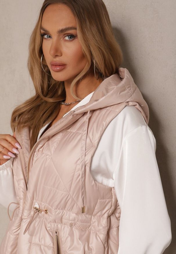 Born2be - Beżowa Dwustronna Kamizelka z Kapturem Zdobiona Pikowanymi Przeszyciami Tuliona. Okazja: na spacer. Typ kołnierza: kaptur. Kolekcja: plus size. Kolor: beżowy. Materiał: jeans. Wzór: aplikacja. Styl: elegancki