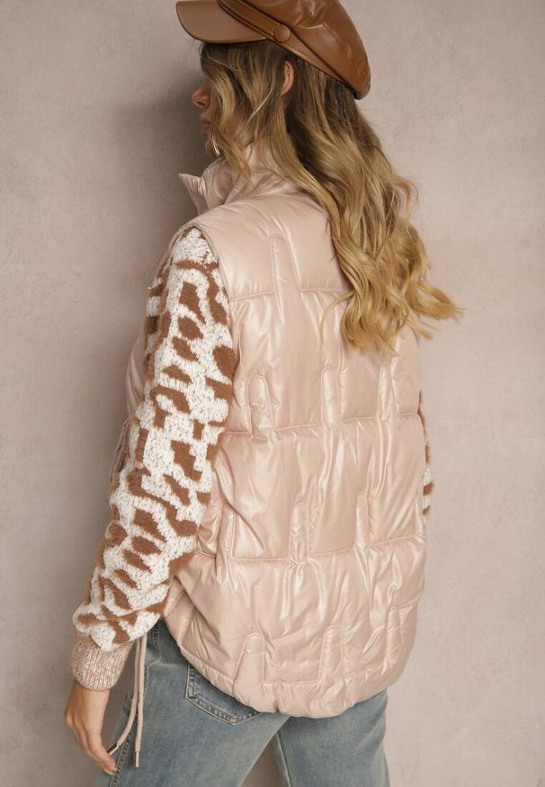 Renee - Różowa Kamizelka Ozdobnie Pikowana z Wysokim Kołnierzem Stójką Irisana. Typ kołnierza: kołnierzyk stójkowy. Kolor: różowy. Materiał: bawełna, jeans