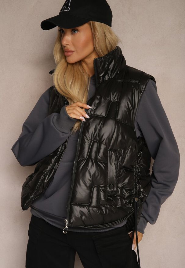 Renee - Czarna Kamizelka Ozdobnie Pikowana z Wysokim Kołnierzem Stójką Irisana. Typ kołnierza: kołnierzyk stójkowy. Kolor: czarny. Materiał: bawełna, jeans
