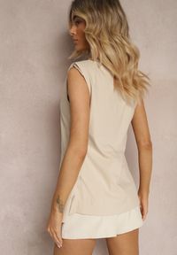 Renee - Beżowa Kamizelka o Wydłużonym Kroju z Bawełną z Ozdobnymi Kieszeniami i Guzikiem Tiamatrix. Okazja: na co dzień. Kolor: beżowy. Materiał: bawełna. Wzór: aplikacja. Styl: casual, elegancki