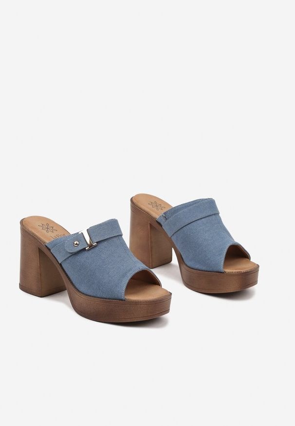 Renee - Ciemnoniebieskie Denimowe Klapki na Grubej Podeszwie z Ozdobnymi Nitami Emritia. Okazja: na co dzień. Nosek buta: otwarty. Kolor: niebieski. Obcas: na obcasie. Styl: casual, elegancki. Wysokość obcasa: średni
