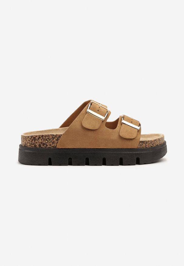 Renee - Ciemnobeżowe Klapki Ozdobione Metalicznym Paskiem Aravolia. Kolor: beżowy. Materiał: jeans. Wzór: aplikacja. Sezon: lato