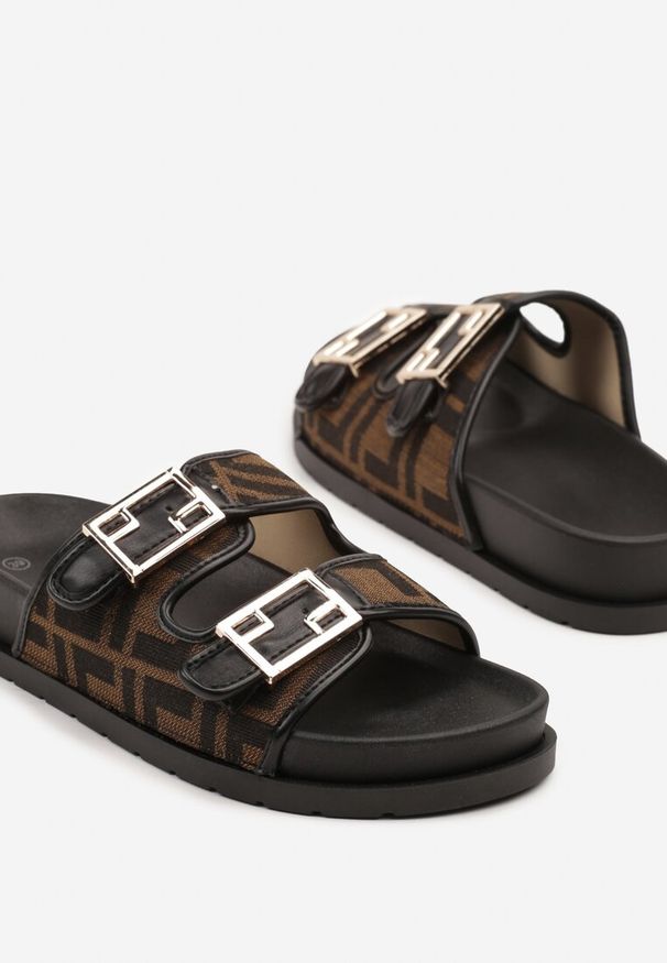 Renee - Ciemnobeżowe Klapki Ozdobione Klamrami Islevis. Okazja: na spacer. Kolor: beżowy. Materiał: len. Wzór: aplikacja. Obcas: na płaskiej podeszwie. Styl: klasyczny