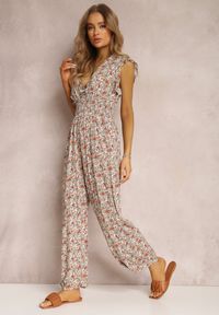Renee - Jasnoróżowy Kombinezon z Ściągaczami na Ramionach w Kwiatowy Wzór Almora. Okazja: na co dzień, na imprezę. Kolor: różowy. Wzór: kwiaty. Sezon: lato. Styl: klasyczny, casual, elegancki
