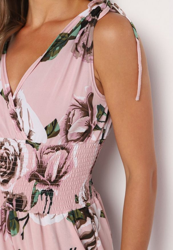 Renee - Jasnoróżowy Koktajlowy Kombinezon Wiązany Paskiem Wykończony Falbankami przy Ramionach Vimaseni. Okazja: na co dzień, na imprezę. Kolor: różowy. Sezon: lato. Styl: wizytowy