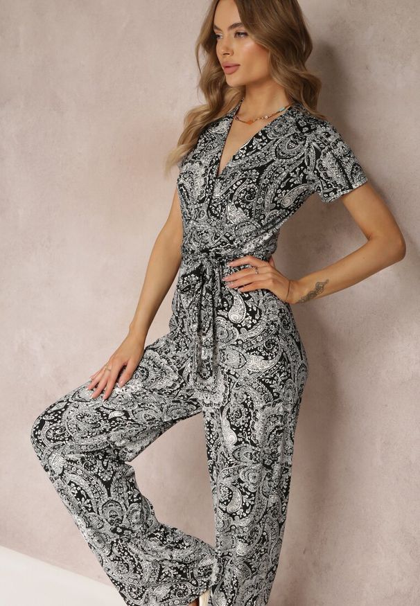Renee - Czarno-Szary Kopertowy Kombinezon z Długimi Nogawkami i Materiałowym Paskiem w Kwiaty Lucianne. Kolor: szary. Materiał: materiał. Długość: długie. Wzór: kwiaty. Sezon: wiosna, lato