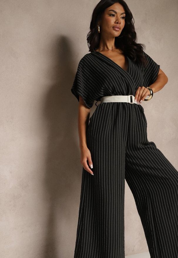 Renee - Czarny Casualowy Kombinezon z Paskiem i Gumką w Pasie Wiązany na Plecach Melodette. Okazja: na co dzień. Kolor: czarny. Materiał: materiał. Długość: długie. Styl: casual