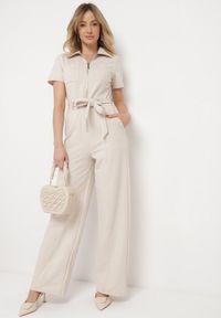 Born2be - Beżowo-Czarny Kombinezon z Kopertowym Dekoltem i Gumką w Pasie Dodatkowo Pasek Junnina. Kolor: beżowy, czarny
