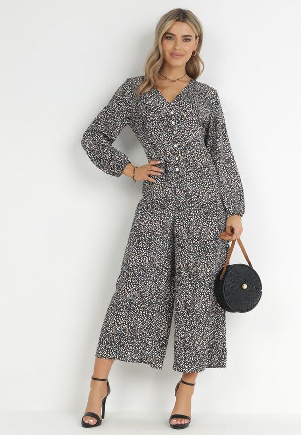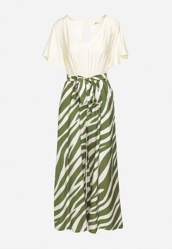 Born2be - Beżowo-Niebieski Kombinezon o Kopertowym Kroju z Dodatkowym Paskiem i Wzorzystą Górą Tinasirae. Okazja: na co dzień. Kolor: zielony. Styl: casual, elegancki