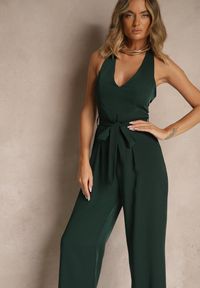 Renee - Ciemnozielony Kombinezon o Taliowanym Kroju z Dekoltem Halter i Wiązanym Paskiem Malisena. Okazja: na co dzień, na randkę, na imprezę. Kolor: zielony. Styl: casual, elegancki