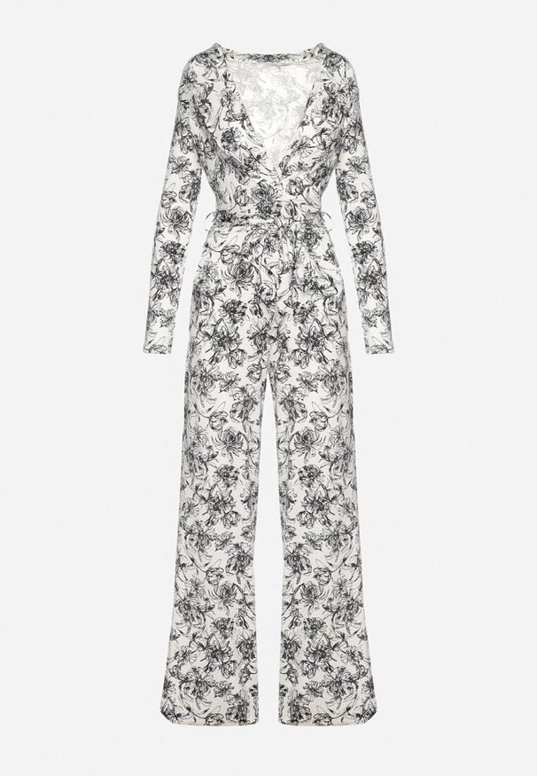 Born2be - Biało-Czarny Kombinezon z Długimi Nogawkami i Kopertowym Dekoltem w Kwiaty Alanessa. Kolor: biały. Długość: długie. Wzór: kwiaty. Styl: elegancki