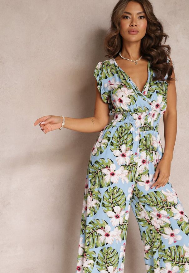 Renee - Jasnoniebieski Kombinezon z Ściągaczami na Ramionach w Kwiatowy Wzór Almora. Okazja: na co dzień, na imprezę. Kolor: niebieski. Wzór: kwiaty. Sezon: lato. Styl: klasyczny, casual, elegancki