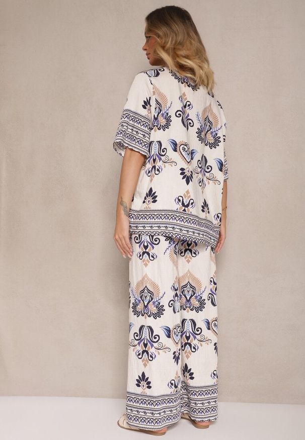 Born2be - Jasnobeżowy Komplet z Wiskozy Koszula i Spodnie Sesanila. Kolor: beżowy. Materiał: wiskoza. Wzór: kolorowy