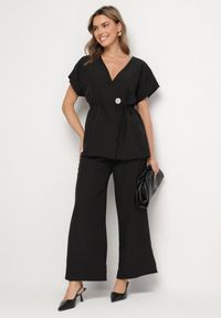 Born2be - Czarny Komplet z Wiskozą Bluzka z Falbanką i Metaliczną Ozdobą oraz Spodnie Dolariela. Kolor: czarny. Materiał: wiskoza. Wzór: aplikacja