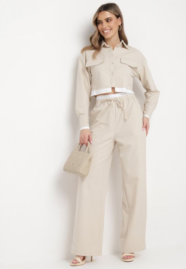 Born2be - Beżowy Komplet Koszula z Asymetrycznym Wiązaniem i Szerokie Spodnie Filivara. Kolor: beżowy
