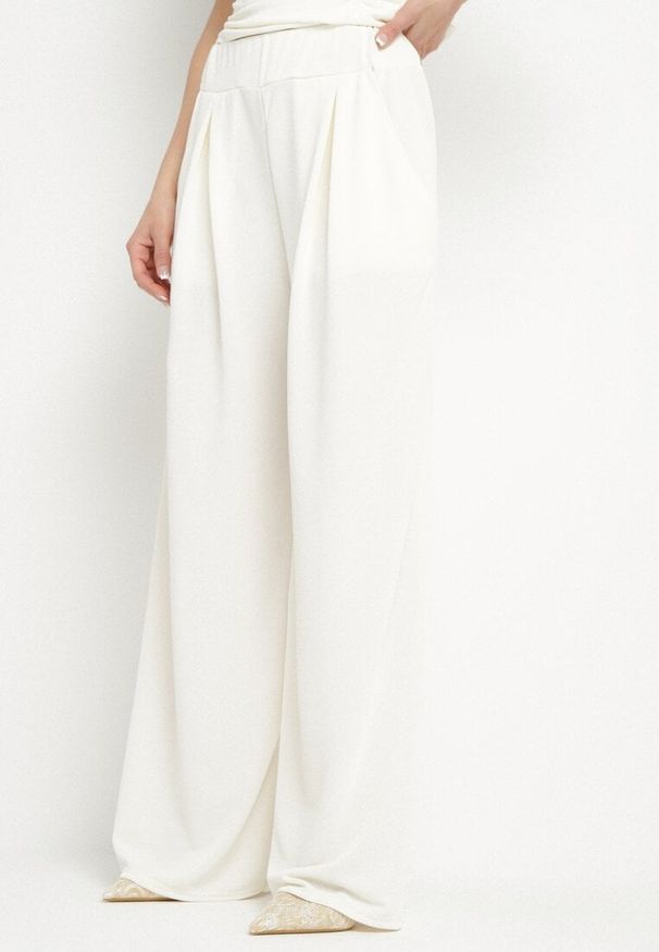 Born2be - Beżowy Komplet w Kwiaty Asymetryczna Bluzka z Marszczeniem i Szerokie Spodnie Linamia. Kolor: beżowy. Materiał: materiał. Wzór: kwiaty