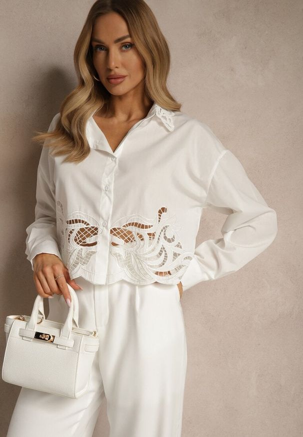 Renee - Biała Casualowa Koszula Ozdobiona z Przodu Aplikacją Nestalisa. Okazja: na co dzień. Kolor: biały. Materiał: jeans. Długość rękawa: długi rękaw. Długość: długie. Wzór: aplikacja. Styl: casual