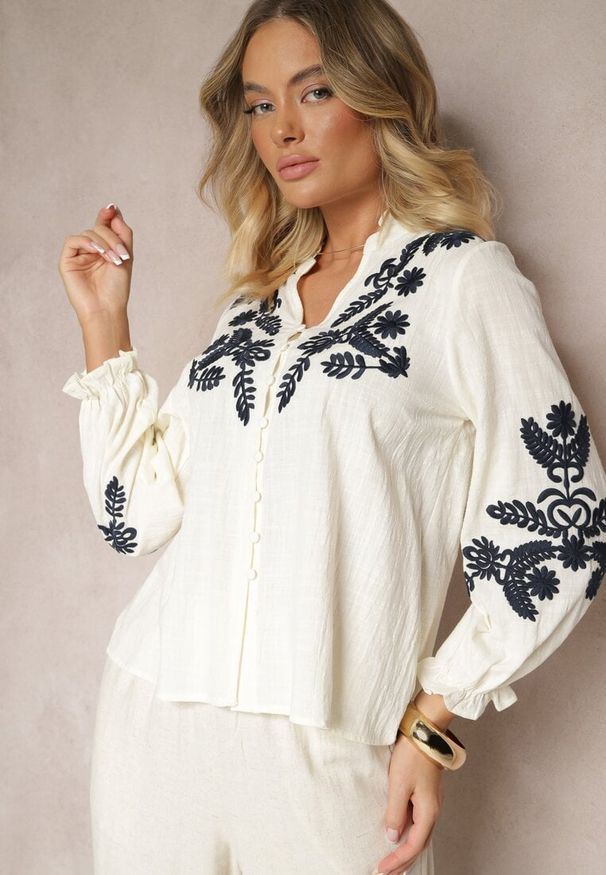 Born2be - Jasnobeżowa Koszula z Długim Rękawem Zapinana na Guziki w Abstrakcyjny Wzór Jastar. Okazja: na spotkanie biznesowe. Typ kołnierza: kołnierzyk klasyczny. Kolor: beżowy. Materiał: jeans. Długość rękawa: długi rękaw. Długość: długie. Styl: biznesowy, klasyczny, elegancki