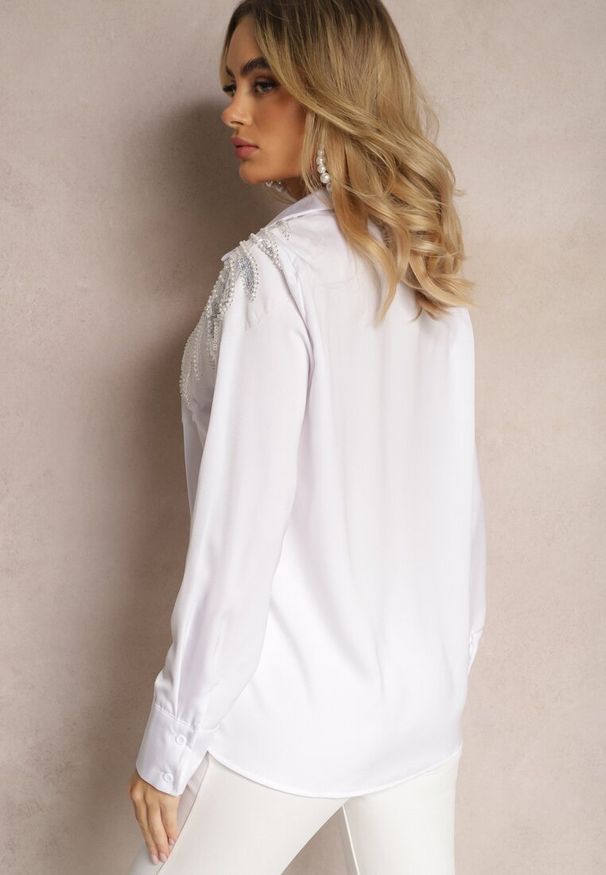 Renee - Fioletowa Klasyczna Koszula z Kieszeniami Zdobiona Cyrkoniami i Kwiatowym Detalem Herlla. Kolor: fioletowy. Długość rękawa: długi rękaw. Długość: długie. Wzór: aplikacja, kwiaty. Styl: klasyczny