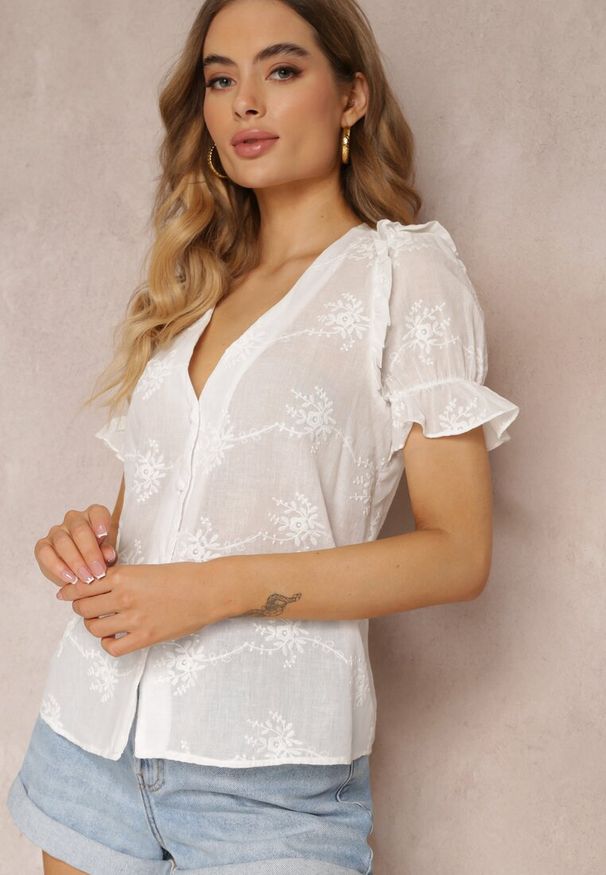 Born2be - Biała Bawełniana Koszula o Krótkim Fasonie z Ażurowym Wykończeniem Leama. Kolor: biały. Materiał: bawełna. Długość: krótkie. Wzór: ażurowy. Sezon: lato