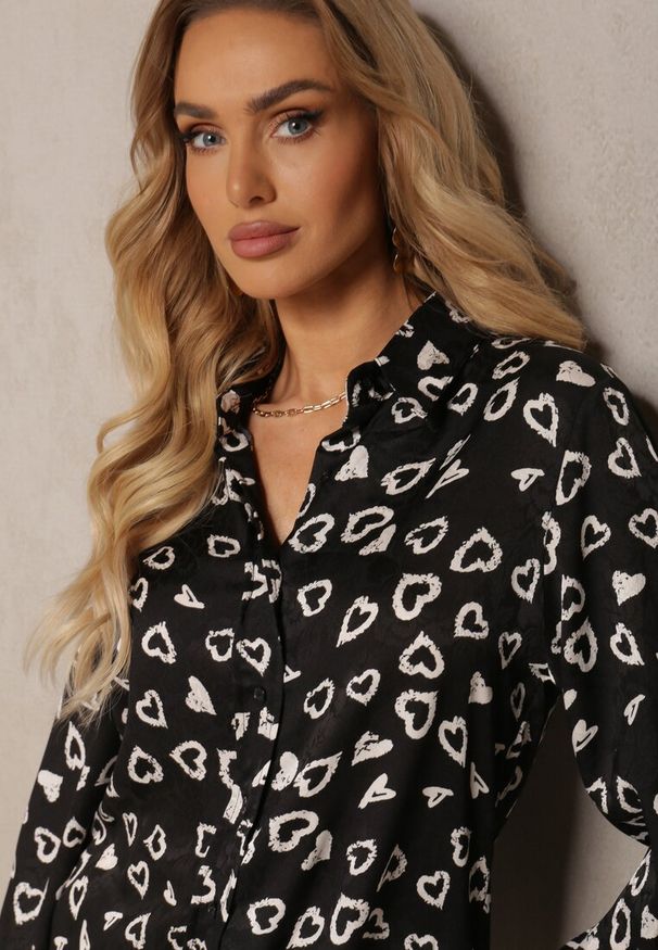 Renee - Czarno-Biała Koszula o Dłuższym Kroju Ozdobiona i Abstrakcyjnym Wzorem Koriassa. Okazja: na co dzień, na imprezę. Kolor: czarny. Materiał: jeans. Długość: długie. Wzór: aplikacja. Styl: casual, elegancki