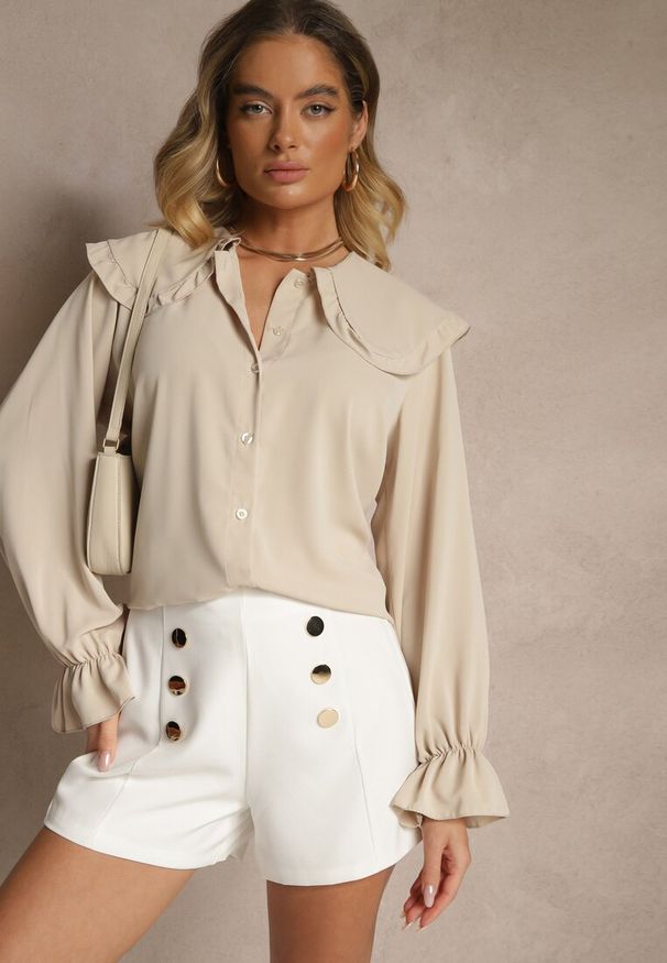 Renee - Beżowa Koszula Ozdobiona Wzorem w Nieregularne Kropki Maetta. Okazja: na co dzień. Kolor: beżowy. Materiał: skóra, jeans. Wzór: aplikacja, kropki. Styl: casual, elegancki