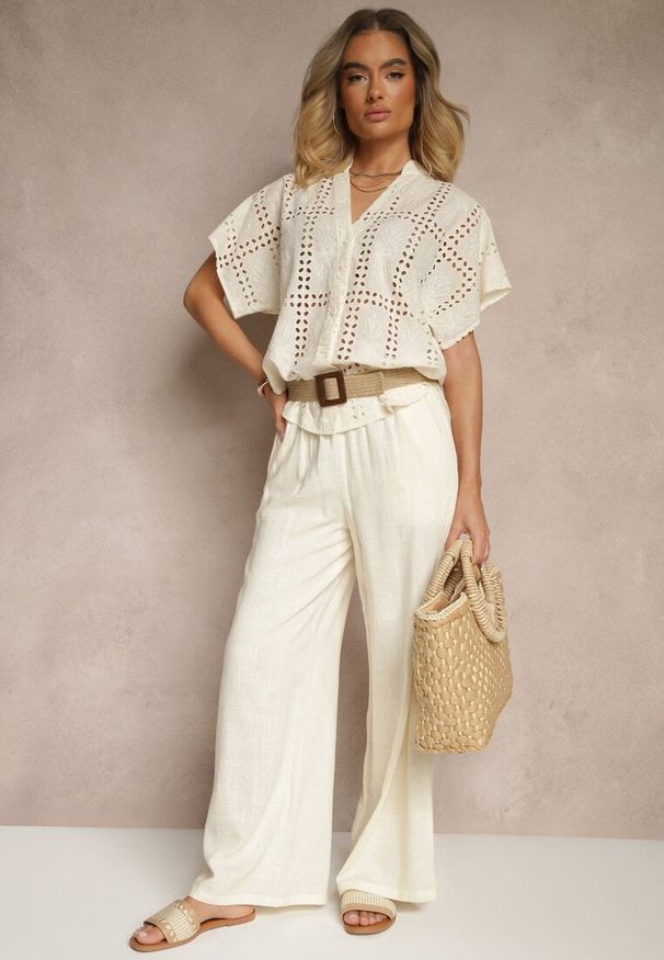 Renee - Biała Koszula z Bawełny Ozdobiona Ażurowym Wzorem Natalena. Okazja: na co dzień. Kolor: biały. Materiał: bawełna. Długość rękawa: krótki rękaw. Długość: krótkie. Wzór: aplikacja, ażurowy. Styl: casual
