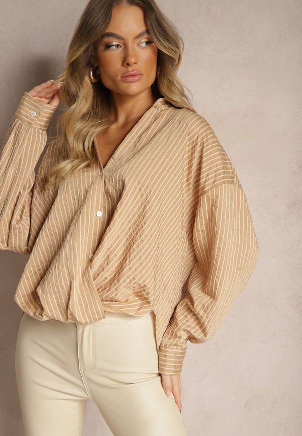 Renee - Beżowa Koszula z Bawełny Ozdobiona Falbanką i Haftem Feliren. Okazja: na co dzień. Typ kołnierza: kołnierzyk stójkowy. Kolor: beżowy. Materiał: bawełna. Długość rękawa: długi rękaw. Długość: długie. Wzór: aplikacja, haft. Styl: casual, elegancki