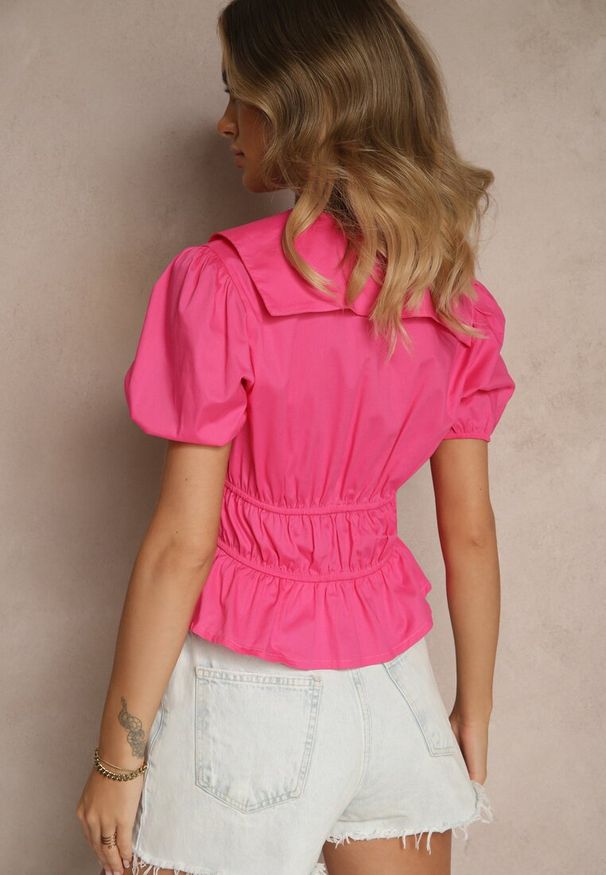 Renee - Niebieska Koszula Zdobiona Falbanami i Wiązaniem przy Szyi Ravissa. Okazja: na co dzień. Kolor: niebieski. Wzór: aplikacja. Sezon: wiosna, lato. Styl: casual, elegancki