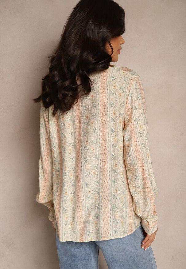Renee - Beżowo-Czerwona Kwiatowa Koszula z Prześwitującymi Rękawami Arrmalia. Okazja: na co dzień. Kolor: beżowy. Materiał: jeans. Wzór: kwiaty. Styl: casual, elegancki