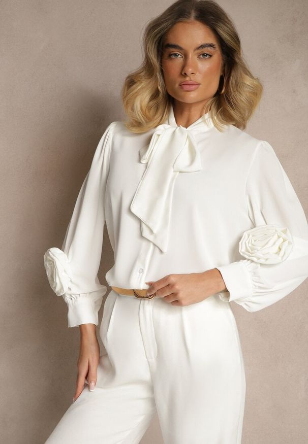 Born2be - Biała Koszula z Ozdobnym Wiązaniem i Falbankami Zalimira. Okazja: na co dzień. Typ kołnierza: kołnierz z falbankami. Kolor: biały. Materiał: jeans. Styl: casual, elegancki