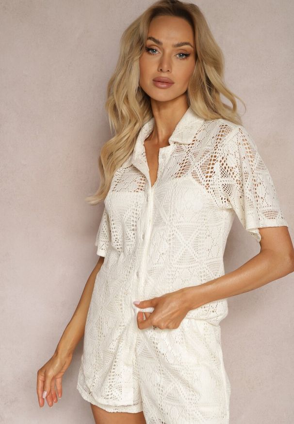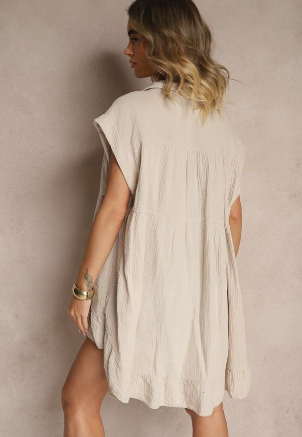 Renee - Beżowa Koszula z Falbanką Novialene. Okazja: na co dzień, na imprezę. Kolor: beżowy. Materiał: jeans. Długość rękawa: krótki rękaw. Długość: krótkie. Sezon: lato. Styl: klasyczny, casual