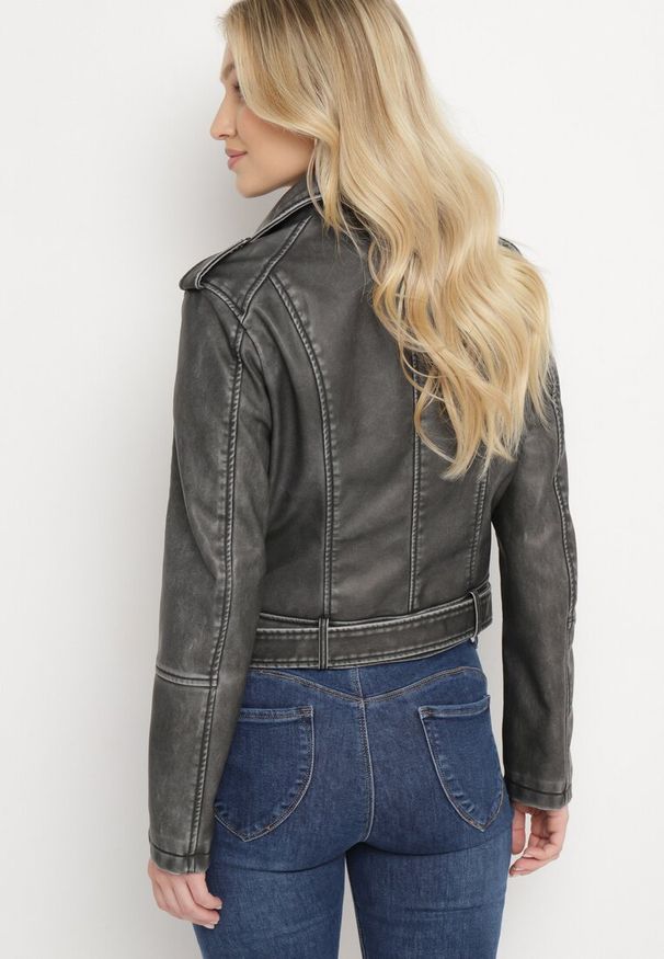 Renee - Ciemnoszara Kurtka o Kroju Ramoneski z Paskiem ze Sprzączką i Kieszeniami Milvila. Okazja: na co dzień. Kolor: szary. Materiał: jeans. Styl: casual, klasyczny, rockowy, elegancki