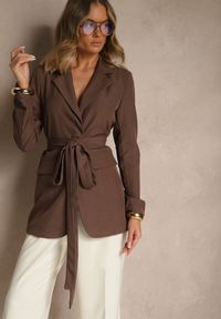 Renee - Brązowa Sukienkowa Marynarka Wiązana Paskiem w Talii Ardthana. Okazja: na spotkanie biznesowe. Kolor: brązowy. Materiał: poliester, materiał. Styl: biznesowy, elegancki