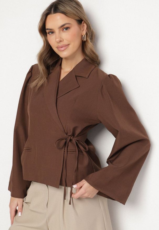 Born2be - Beżowa Marynarka z Szerokimi Rękawami i Asymetrycznym Wiązaniem Sanessia. Kolor: beżowy. Materiał: jeans. Styl: elegancki