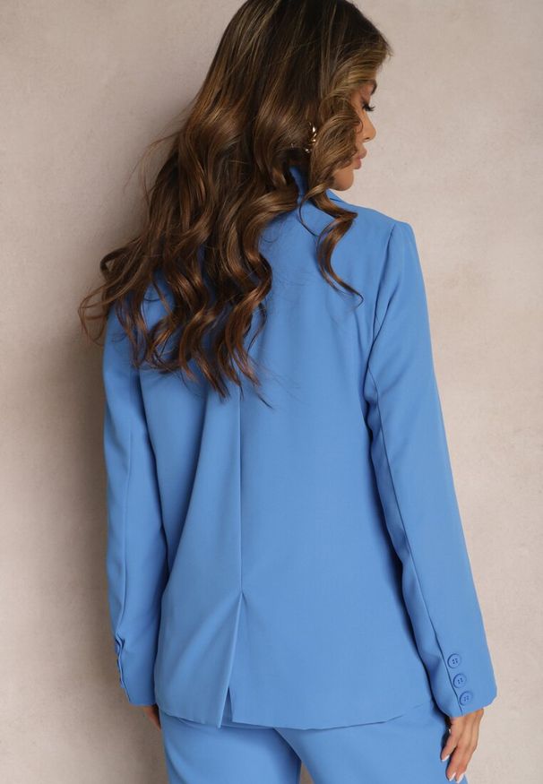 Renee - Niebieska Pudełkowa Marynarka o Kwiatowym Wzorze z Podpinanymi Rękawami o Dłuższym Kroju Destana. Okazja: na co dzień. Kolor: niebieski. Długość: długie. Wzór: kwiaty. Styl: casual, elegancki